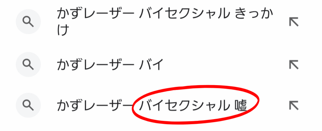 Googleの関連キーワードには『かずレーザー バイセクシャル 嘘』というキーワードも見られます。